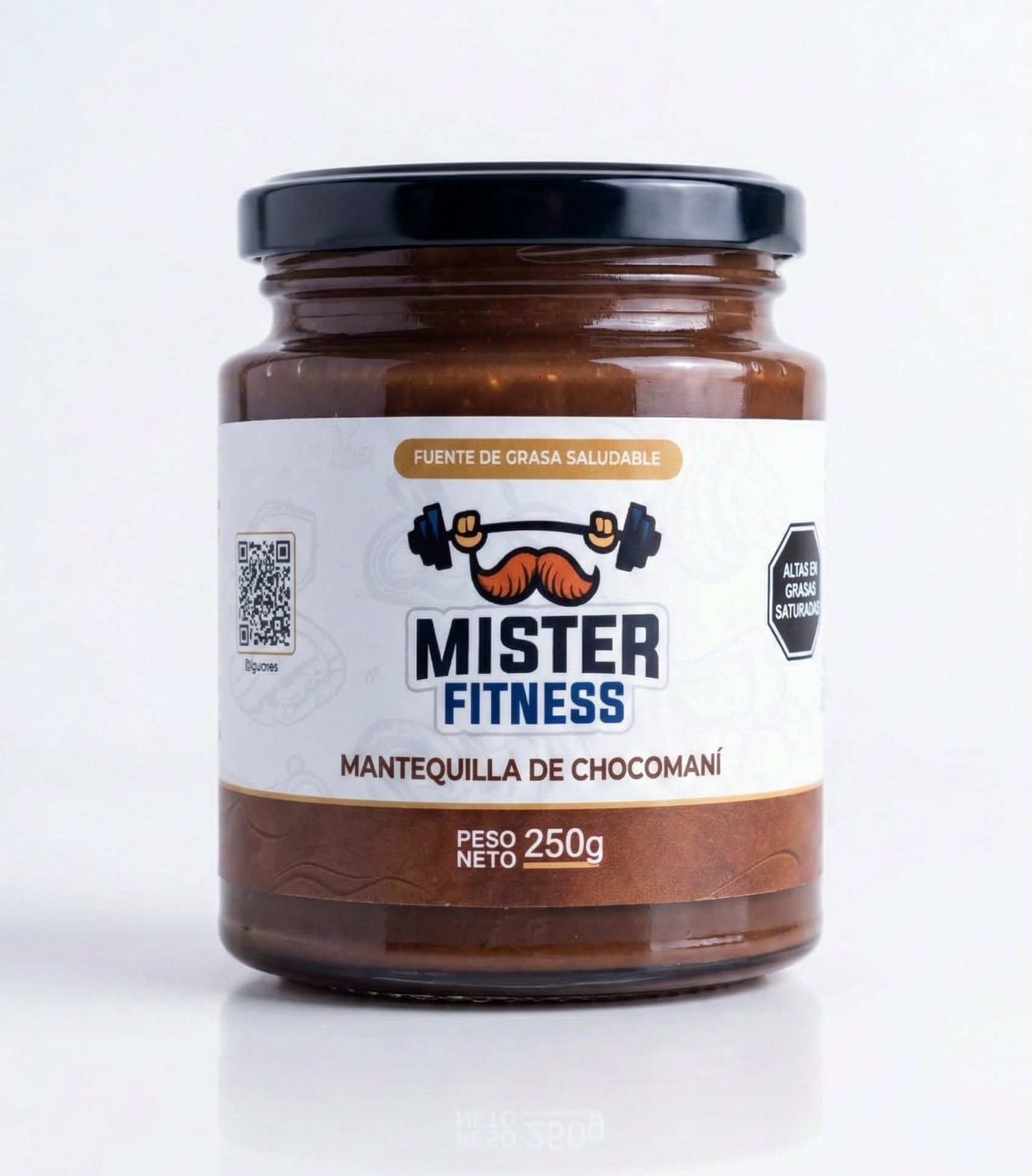 Disfruta el equilibrio perfecto entre nutrición y sabor con nuestra Mantequilla de Chocomani Mister Fitness, elaborada con maní seleccionado y cacao para lograr una combinación deliciosa y naturalmente energética.